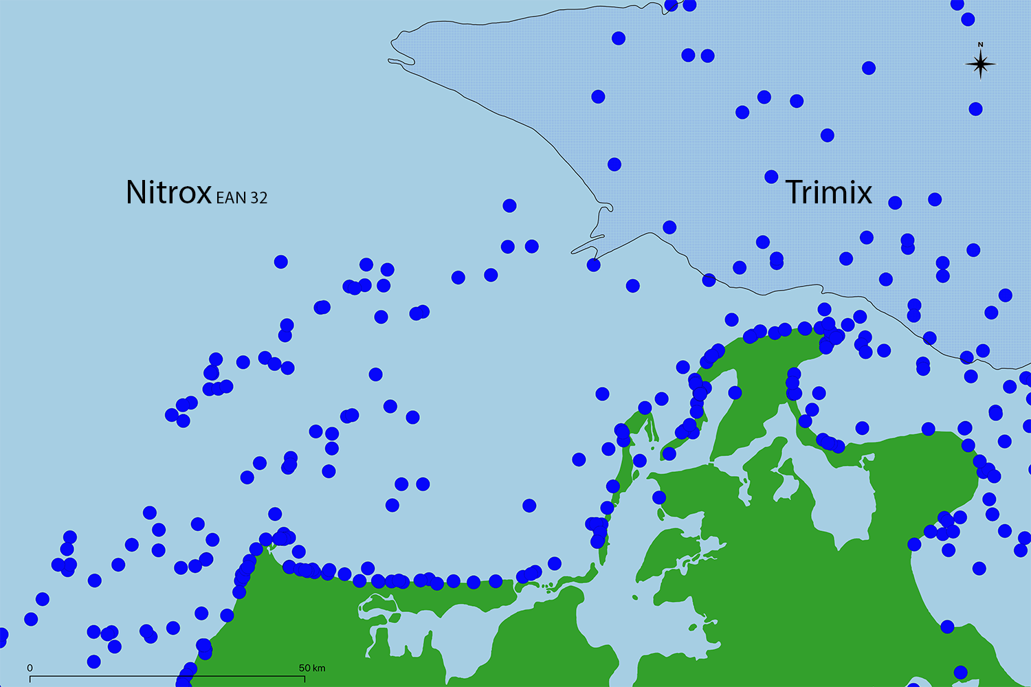 Zwar ist die Tauchtiefe mit dem gängigen EAN32 Gemisch auf rund 33 m limitiert, doch lassen sich damit viele der bekannten Wracks vor unserer Küste erreichen. Einzig die im Arkonabecken nördlich und nordöstlich von Rügen liegenden Wrackfunde liegen zum Teil tiefer. Nitrox bietet somit den perfekten Einstieg in das technische Tauchen und veranlasste uns 2024 einige anspruchsvollere Wracks in die Liste unserer Tauchziele aufzunehmen.